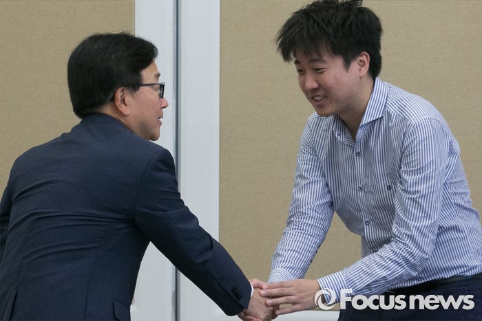 (서울=포커스뉴스) 21일 오전 서울 여의도 국회 귀빈식당에서 열린 새누리당 일자리특위 1차 회의에 참석한 이준석(오른쪽) 클라세스튜디오 대표가 이동근 대한상공회의소 부회장과 인사하고 있다.
