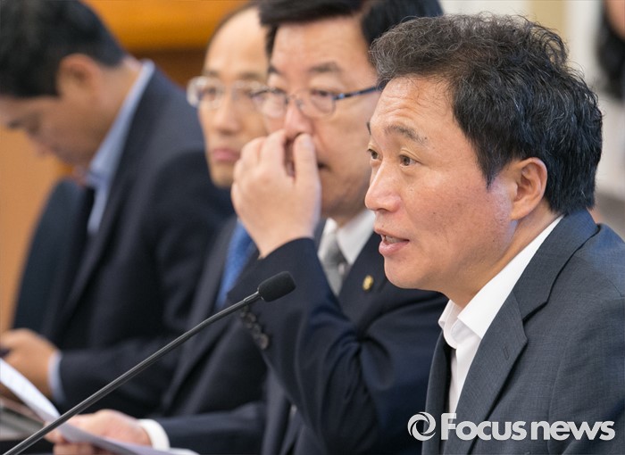 (서울=포커스뉴스) 21일 오전 서울 여의도 국회 귀빈식당에서 열린 새누리당 일자리특위 1차 회의에 참석한 이학재 위원장이 모두발언을 하고 있다.