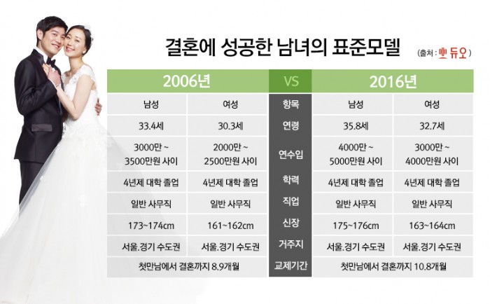 결혼정보회사 듀오는 성혼(成婚) 회원 3만3000여명 중 최근 2년 간(2014년 6월~2016년 5월) 혼인한 초혼 부부 3000명(1500쌍)을 표본 조사한 '2016년 혼인통계 보고서'를 21일 공개했다.