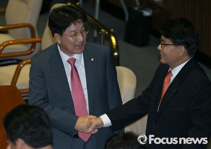 (서울=포커스뉴스) 21일 오전 서울 여의도 국회에서 열린 343회 국회(임시회) 4차 본회의에 참석한 권성동(왼쪽) 새누리당 사무총장과 윤상현 의원이 인사하고 있다.