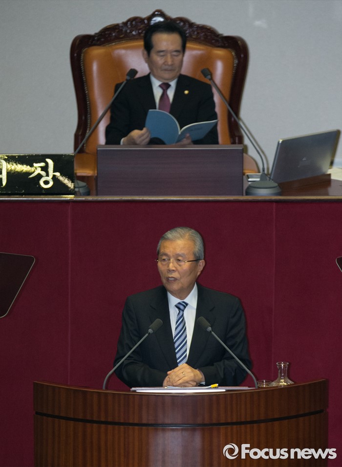 (서울=포커스뉴스) 21일 오전 서울 여의도 국회에서 열린 343회 국회(임시회) 4차 본회의에 참석한 김종인 더불어민주당 비대위 대표가 교섭단체 대표연설을 하고 있다.