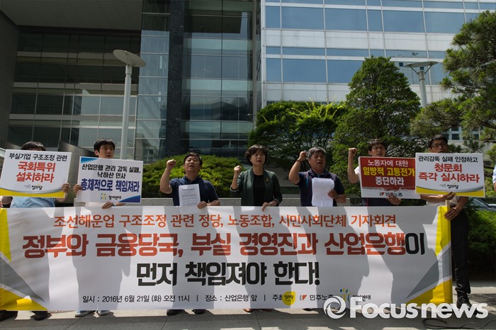 (서울=포커스뉴스) 21일 오전 서울 영등포구 산업은행 본점 앞에서 열린 조선해운업 구조조정 관련 정부와 금융당국, 산업은행 규탄 기자회견에 참석한 이정미(가운데) 정의당 원내수석부대표를 비롯한 참석자들이 정부와 금융당국을 규탄하는 구호를 외치고 있다.