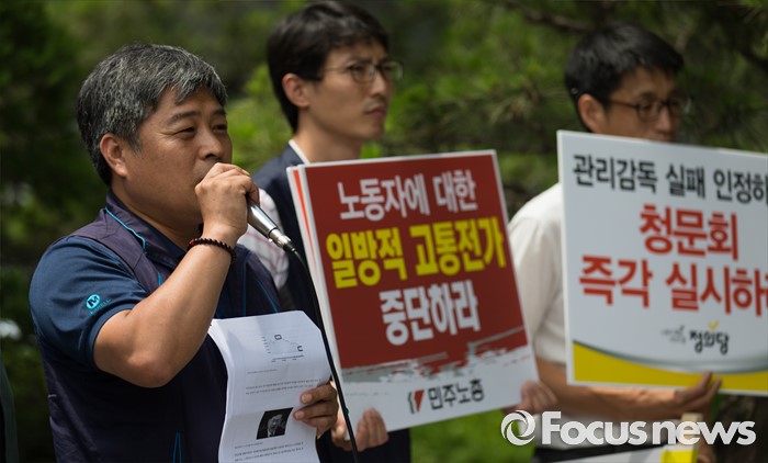 (서울=포커스뉴스) 21일 오전 서울 영등포구 산업은행 본점 앞에서 열린 조선해운업 구조조정 관련 정부와 금융당국, 산업은행 규탄 기자회견에서 이상진(왼쪽) 전국민주노동조합총연맹 부위원장이 모두발언 하고 있다.