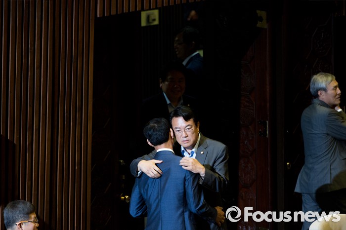 (서울=포커스뉴스) 정진석 새누리당 원내대표와 최정호 국토교통부 제2차관이 21일 오전 서울 여의도 국회에서 열린 본회의에 참석해 대화를 나누고 있다.