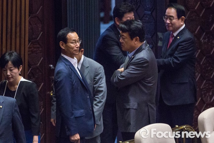 (서울=포커스뉴스) 정진석 새누리당 원내대표와 최정호 국토교통부 제2차관이 21일 오전 서울 여의도 국회에서 열린 본회의에 참석해 대화를 나누고 있다.