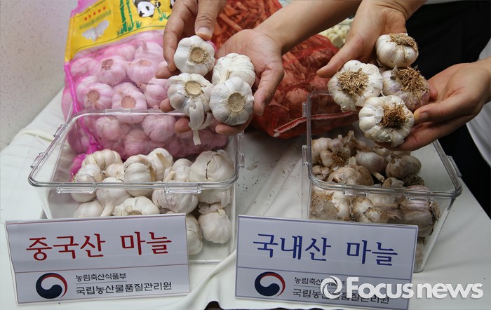 (세종=포커스뉴스) 국립농산물품질관리원 직원들이 21일 오전 세종시정부세종청사 농림축산식품부 기자실에서 국내산 마늘과 중국산 마늘을 비교하고 있다. 중국산 마늘은 잔뿌리가 제거돼 깨끗한 상태다.