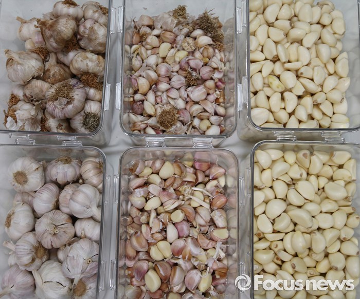 (세종=포커스뉴스) 국립농산물품질관리원 직원들이 21일 오전 세종시정부세종청사 농림축산식품부 기자실에서 국내산 마늘과 중국산 마늘을 비교하고 있다. 사진은 국내산(위)과 중국산(아래)의 탈피과정의 마늘 모습.