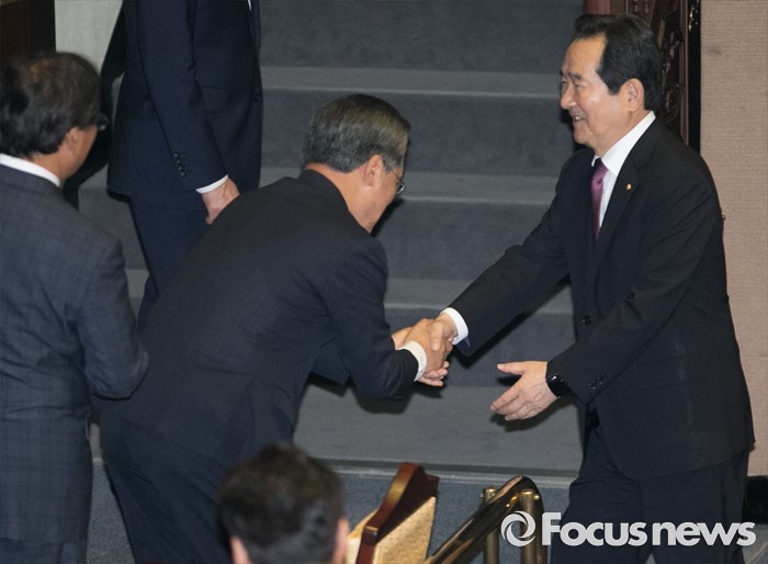 (서울=포커스뉴스) 21일 오전 서울 여의도 국회에서 343회 국회(임시회) 4차 본회의를 마친 뒤 정세균(오른쪽) 국회의장과 우윤근 신임 국회 사무총장이 악수하고 있다.