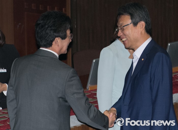 (서울=포커스뉴스) 21일 오전 서울 여의도 국회에서 열린 343회 국회(임시회) 4차 본회의에 참석한 유승민(왼쪽) 새누리당 의원과 김성식 국민의당 정책위의장이 인사하고 있다.