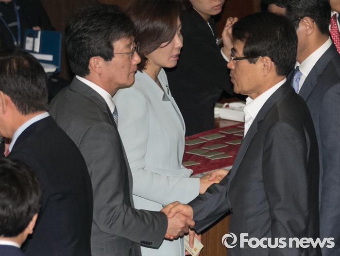 (서울=포커스뉴스) 21일 오전 서울 여의도 국회에서 열린 343회 국회(임시회) 4차 본회의에 참석한 유승민(왼쪽), 이군현 새누리당 의원이 인사하고 있다.