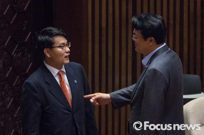 (서울=포커스뉴스) 정진석(오른쪽) 새누리당 원내대표와 윤상현 새누리당 의원이 21일 오전 서울 여의도 국회에서 열린 본회의에 참석해 대화를 나누고 있다.
