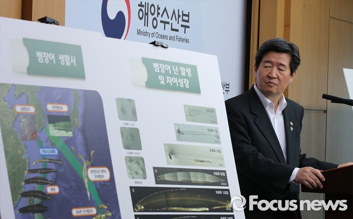 (세종=포커스뉴스) 윤학배 해양수산부 차관이 21일 오전 세종시 정부세종청사 해수부 기자실에서 뱀장어 완전양식 기술 세계 2번째 개발성공 브리핑을 하고 있다.
