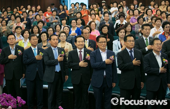 (서울=포커스뉴스) 21일 오후 서울 여의도 국회도서관에서 열린 사단법인 한국여성정치연맹 창립 25주년 기념 토론회에 참석한 정세균 국회의장과 정우택 새누리당 의원, 천정배 국민의당 공동대표, 박지원 원내대표 등이 국기에 대한 경례를 하고 있다.