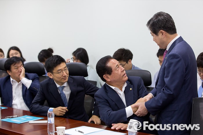 (서울=포커스뉴스) 동남권 신공항 입지발표를 앞두고 발표 중계방송 시청을 위해 모인 유기준(오른쪽) 새누리당 의원과 배덕광 의원이 21일 오후 서울 여의도 국회의원회관에서 대화를 나누고 있다.