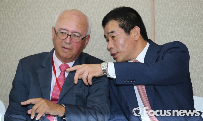 (세종=포커스뉴스) 장 마리 슈발리에 프랑스 파리공항공단자회사 ADPi 수석엔지니어 21일 오후 세종시 정부세종청사 국토교통부 브리핑실에서 열린 동남권가 신공항 타당성 검토 연구 최종 보고회에 앞서 서훈택 국토부 항공정책실장과 대화하고 있다.