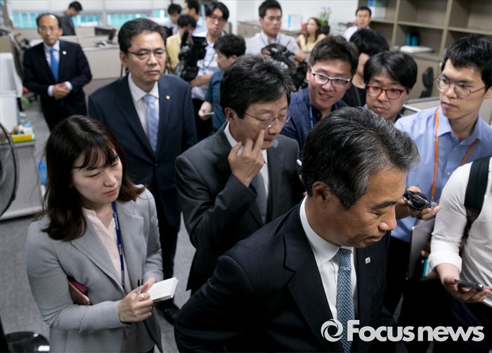 (서울=포커스뉴스) 정종섭(오른쪽부터), 유승민, 곽상도, 추경호 새누리당 의원이 21일 오후 서울 여의도 국회 의원회관 윤재옥 의원실에서 대구 지역 의원모임을 갖고 영남권 신공항 결과 발표를 지켜본 뒤 퇴장하고 있다.
