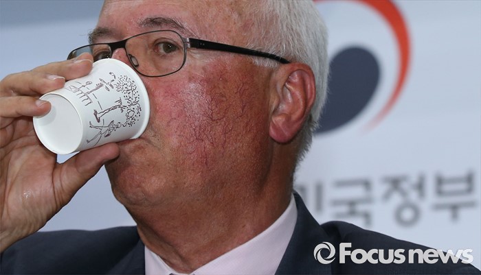 (세종=포커스뉴스) 장 마리 슈발리에 프랑스 파리공항공단자회사 ADPi 수석엔지니어가 21일 오후 세종시 정부세종청사 국토교통부 브리핑실에서 열린 동남권 신공항 타당성 검토 연구 최종 보고회에서 입지선정 결과 발표를 마치고 목을 축이고 있다.
