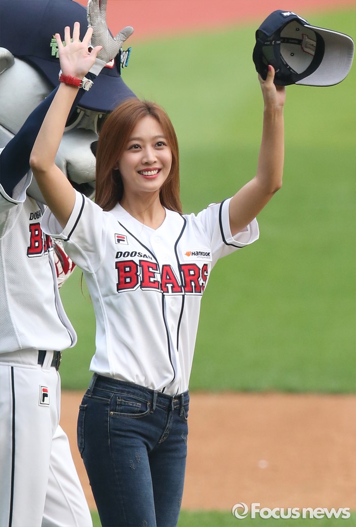 (서울=포커스뉴스) 21일 서울 잠실구장에서 열린 2016 프로야구 kt-두산 경기에서 시구자로 나온 배우 조보아가 팬들에게 손을 흔들며 인사하고 있다.