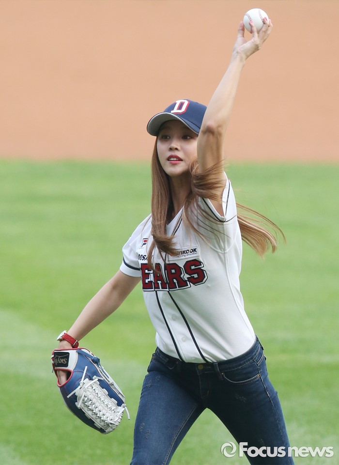 (서울=포커스뉴스) 21일 서울 잠실구장에서 열린 2016 프로야구 kt-두산 경기에서 배우 조보아가 시구를 하고 있다.