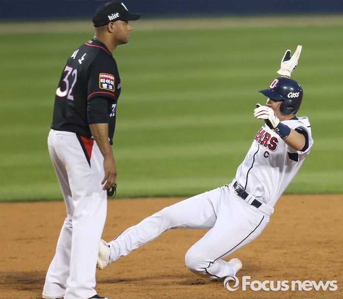 (서울=포커스뉴스) 12일 서울 잠실구장에서 열린 2016 프로야구 kt-두산 경기 4회말 무사 1루에서 두산 박건우의 우전 안타때 1루주자 김재호가 3루에서 슬라이딩하고 있다.