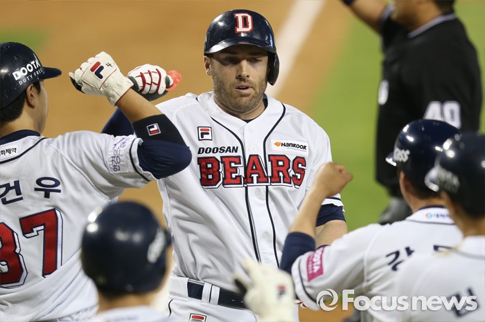 (서울=포커스뉴스) 12일 서울 잠실구장에서 열린 2016 프로야구 kt-두산 경기 4회말 1사후 두산 에반스가 만루홈런을 치고 선행주자들의 환영을 받으며 홈인하고 있다.