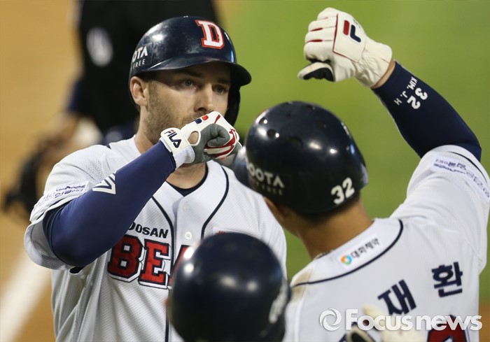 (서울=포커스뉴스) 12일 서울 잠실구장에서 열린 2016 프로야구 kt-두산 경기 4회말 1사후 두산 에반스가 만루홈런을 치고 선행주자 김재환의 환영을 받으며 홈인하고 있다.