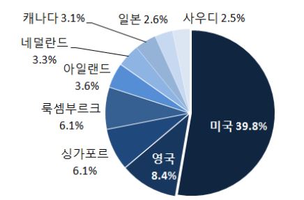 지난 5월 외국인 자금 주식 투자국 중 가장 높은 비중을 차지한 나라는 미국(39.8%)이었으며, 이어 영국(8.4%) 싱가포르·룩셈부르크(6.1%) 등 순이었다.<자료제공=국제금융센터>