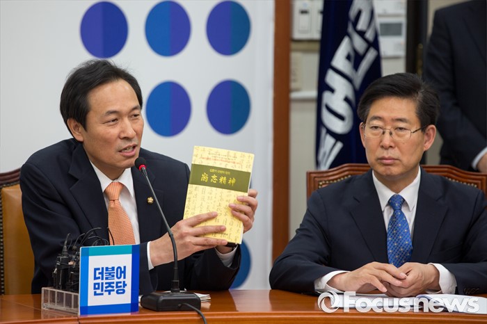(서울=포커스뉴스) 우상호 더불어민주당 원내대표가 22일 오전 서울 여의도 국회에서 열린 비상대책위원회의에 참석해 '상지정신' 책자를 보이며 상시대학교 사태 관련 발언을 하고 있다.