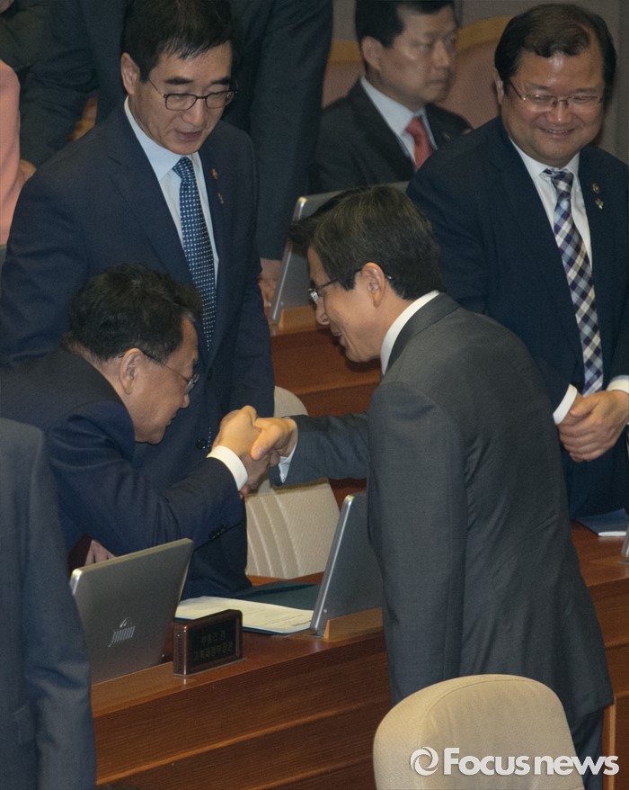 (서울=포커스뉴스) 22일 오전 서울 여의도 국회에서 열린 343회 국회(임시회) 5차 본회의에 참석한 황교안(오른쪽) 국무총리와 유일호 경제부총리 겸 기획재정부 장관이 인사하고 있다.