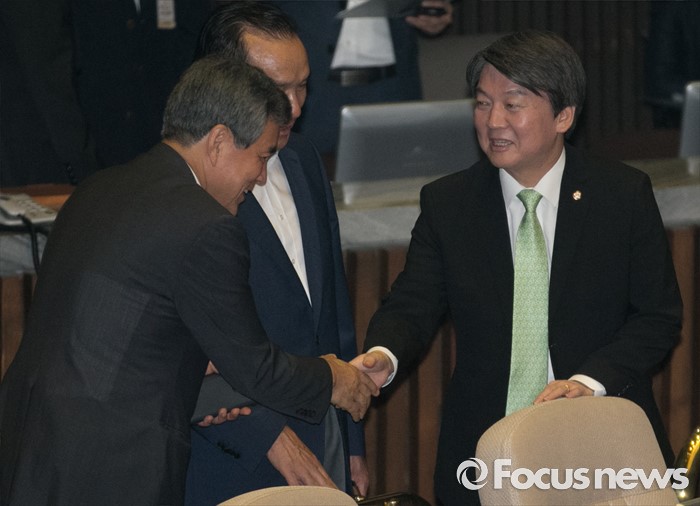 (서울=포커스뉴스) 22일 오전 서울 여의도 국회에서 열린 343회 국회(임시회) 5차 본회의에 참석한 안철수(오른쪽) 국민의당 상임공동대표와 이상돈 최고위원이 인사하고 있다.