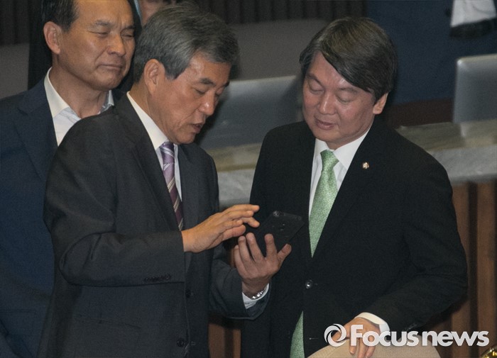 (서울=포커스뉴스) 22일 오전 서울 여의도 국회에서 열린 343회 국회(임시회) 5차 본회의에 참석한 안철수(오른쪽) 국민의당 상임공동대표와 이상돈 최고위원이 인사하고 있다.