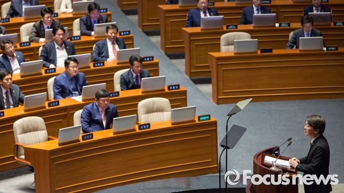(서울=포커스뉴스) 안철수 국민의당 상임공동대표가 22일 오전 서울 여의도 국회에서 교섭단체대표연설을 하고 있다. 한편 총선 홍보비 리베이트 수수 의혹으로 검찰 조사를 하루 앞둔 김수민 국민의당 의원은 본회의장에 모습을 드러내지 않았다. 김 의원의 자리는 사진 왼쪽.
