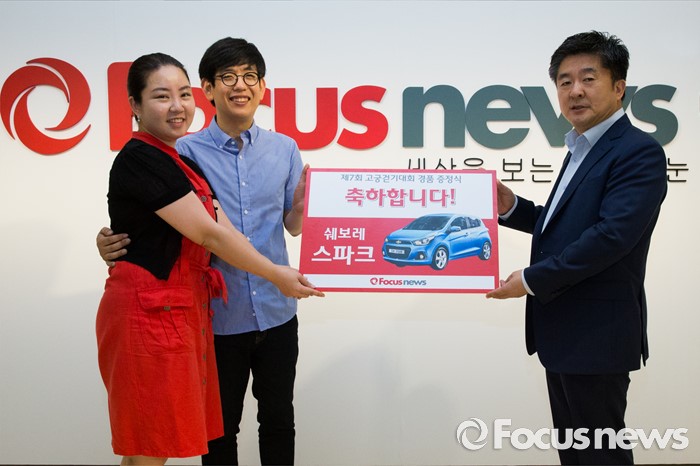 (서울=포커스뉴스) 22일 오전 서울 서초구 포커스뉴스 본사에서한대희 포커스뉴스 대표가 제7회 나라사랑 고궁걷기대회 1등 경품 추첨에 당첨된 이윤옥, 김한준 부부에게 경품을 전달하고 있다.