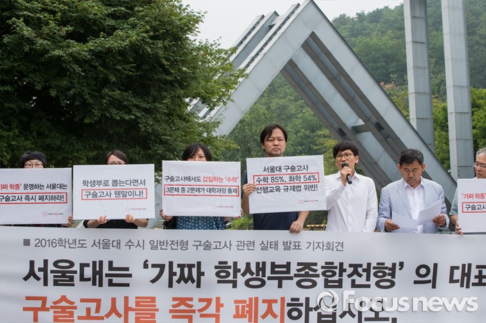 (서울=포커스뉴스) 22일 오전 서울대학교 정문 앞에서 시민단체 '사교육걱정없는세상' 회원들이 '2016학년도 서울대 수시 일반전형 구술고사 관련 실태 발표' 기자회견을 열고 있다.