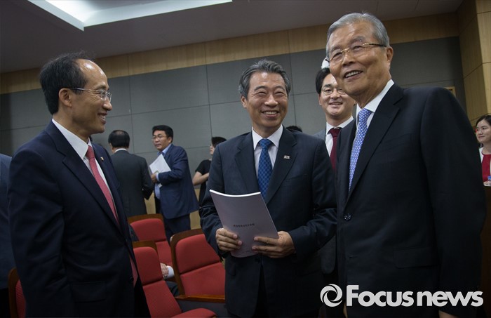 (서울=포커스뉴스) 김종인(오른쪽) 더불어민주당 비상대책위원회 대표가 22일 오전 서울 여의도 국회 의원회관에서 열린 경제재정연구포럼 토론회에서 추경호 새누리당 의원과 대화하고 있다. 가운데는 정종섭 새누리당 의원.