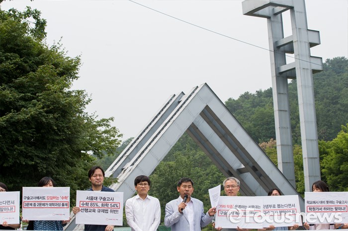 (서울=포커스뉴스) 22일 오전 서울대학교 정문 앞에서 시민단체 '사교육걱정없는세상' 회원들이 '2016학년도 서울대 수시 일반전형 구술고사 관련 실태 발표' 기자회견을 열고 있다.
