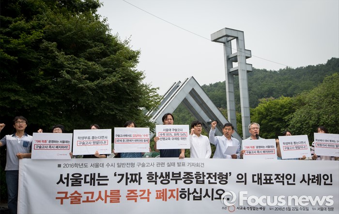 (서울=포커스뉴스) 22일 오전 서울대학교 정문 앞에서 시민단체 '사교육걱정없는세상' 회원들이 '2016학년도 서울대 수시 일반전형 구술고사 관련 실태 발표' 기자회견을 열고 있다.