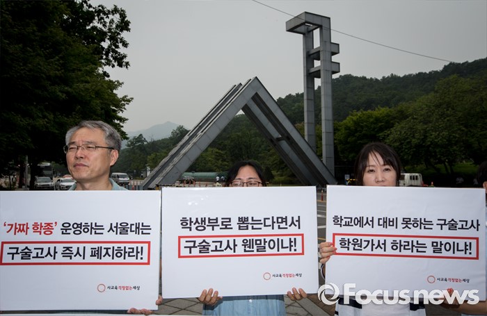 (서울=포커스뉴스) 22일 오전 서울대학교 정문 앞에서 시민단체 '사교육걱정없는세상' 회원들이 '2016학년도 서울대 수시 일반전형 구술고사 관련 실태 발표' 기자회견을 열고 있다.