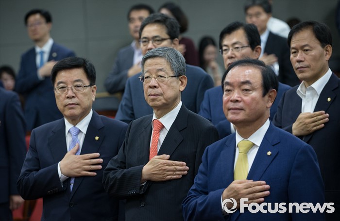 (서울=포커스뉴스) 김광림(왼쪽부터) 새누리당 정책위의장, 김희옥 혁신비상대책위원장, 장병완 국민의당 의원이 22일 오전 서울 여의도 국회 의원회관에서 열린 경제재정연구포럼 토론회에 참석해 국기에 대한 경례를 하고 있다.