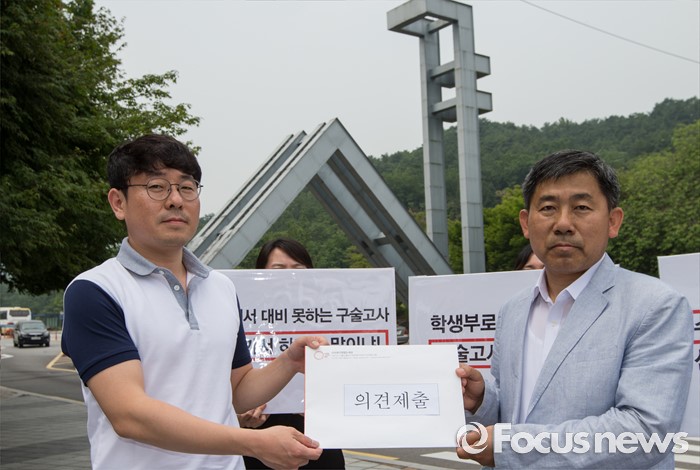 (서울=포커스뉴스) 22일 오전 서울대학교 정문 앞에서 시민단체 '사교육걱정없는세상' 회원들이 '2016학년도 서울대 수시 일반전형 구술고사 관련 실태 발표' 기자회견을 마친 후 학교에 제출할 의경서를 들고 포즈를 취하고 있다.