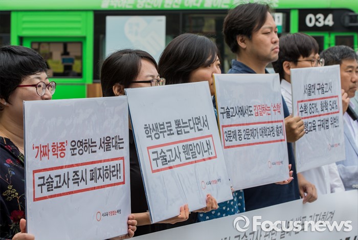 (서울=포커스뉴스) 22일 오전 서울대학교 정문 앞에서 시민단체 '사교육걱정없는세상' 회원들이 '2016학년도 서울대 수시 일반전형 구술고사 관련 실태 발표' 기자회견을 열고 있다.