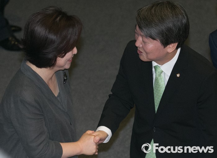 (서울=포커스뉴스) 22일 오전 서울 여의도 국회에서 열린 343회 국회(임시회) 5차 본회의에 참석한 안철수(오른쪽) 국민의당 상임공동대표가 교섭단체 대표연설을 마친 뒤 심상정 정의당 상임대표와 악수하고 있다.