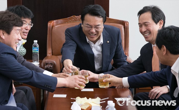 (서울=포커스뉴스) 22일 오전 서울 여의도 국회에서 운영위원회 전체회의를 마친 뒤 정진석 새누리당 원내대표, 우상호 더불어민주당 원내대표 등 의원들이 음료를 마시며 논의 중 건배를 하고 있다. 왼쪽부터 기동민 더불어민주당 원내대변인, 박완주 원내수석부대표, 정진석 새누리당 원내대표, 우상호 더불어민주당 원내대표, 김관영 국민의당 원내수석부대표.