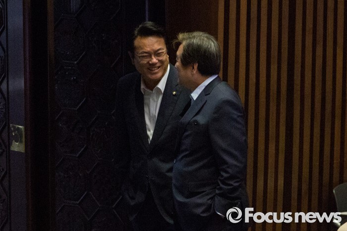 (서울=포커스뉴스) 정진석 새누리당 원내대표와 김무성 새누리당 전 대표가 22일 오전 서울 여의도 국회에서 열린 본회의에 참석해 대화 하고 있다.