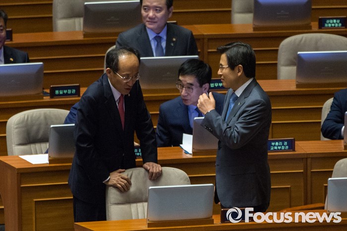 (서울=포커스뉴스) 황교안(오른쪽) 국무총리와 추경호 새누리당 의원이 22일 오전 서울 여의도 국회에서 열린 본회의에 참석해 대화 나누고 있다.