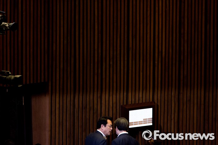(서울=포커스뉴스) 정진석 새누리당 원내대표와 김무성 새누리당 전 대표가 22일 오전 서울 여의도 국회에서 열린 본회의에 참석해 대화 하고 있다.