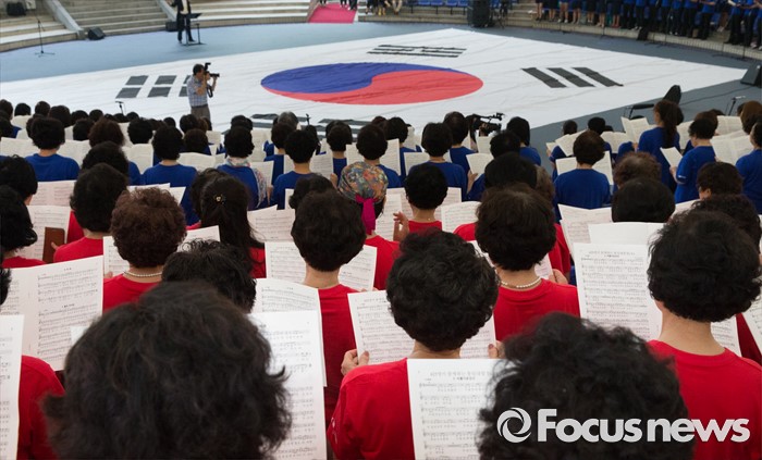 (서울=포커스뉴스) 22일 오전 서울 송파구 서울놀이마당에서 열린 '통일대합창, 625명이 함께하는 평화공감' 행사에 참가한 송파구민들이 합창하고 있다. 이번 행사는 관내 합창단과 노래동아리 등 송파구민 1000여명이 신청해 2주전부터 개별적으로 연습 한 후 통일대합창에 참가 했다.