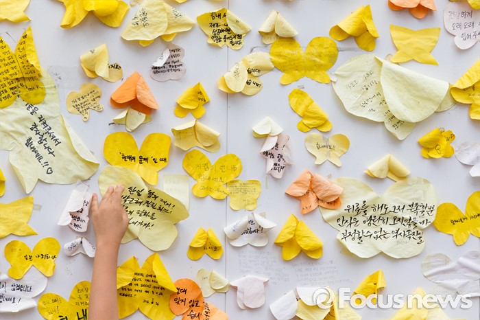 (서울=포커스뉴스) 22일 오후 서울 종로구 옛 일본대사관 앞에서 열린 제1236차 일본군 위안부 문제해결을 위한 정기수요집회에서 한 어린이가 할머니들에게 보내는 메시지를 살펴보고 있다.