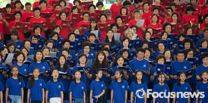(서울=포커스뉴스) 22일 오전 서울 송파구 서울놀이마당에서 열린 '통일대합창, 625명이 함께하는 평화공감' 행사에 참가한 송파구민들이 합창하고 있다. 이번 행사는 관내 합창단과 노래동아리 등 송파구민 1000여명이 신청해 2주전부터 개별적으로 연습 한 후 통일대합창에 참가 했다.