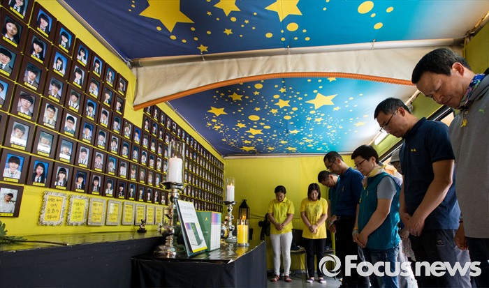 (서울=포커스뉴스) 세월호 참사 800일을 하루 앞둔 22일 오전 서울 종로구 광화문 광장에서 열린 '세월호 특별법 개정 촉구와 800일 계기수업 선포' 기자회견을 마친 전국교직원노동조합 조합원들이 광화문 416가족분향소를 찾아 묵념하고 있다.